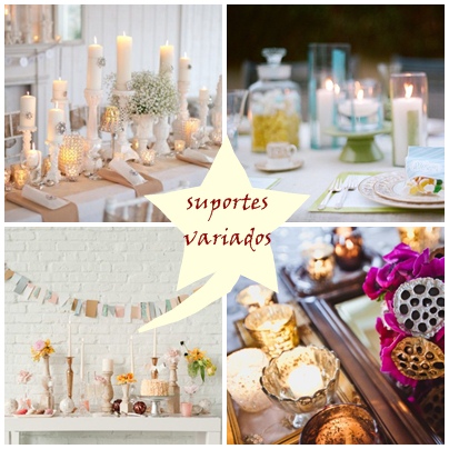 Quem não gosta de um romântico jantar à luz de velas? Você pode achar que utilizar "velas", não é uma opção muito criativa na decoração de casamento. Puro engano. Na verdade, tudo vai depender da forma como você vai decorar. O ideal é inovar os suportes, em vez de utilizar os velhos castiçais tradicionais. Colocá-las em objetos e lugares inusitados, como escadas, misturar peças descoordenadas, por exemplo, em copos, taças, garrafas... pode fazer toda a diferença. Iluminar jardins e lugares sombrios com velas em suportes suspensos, também pode ficar super charmoso. Vejam algumas opções: